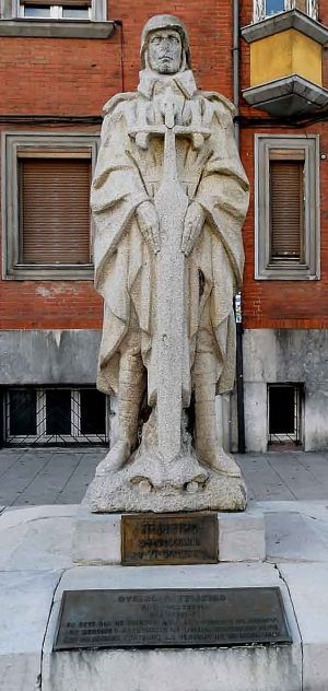 La estatua, obra de Francisco Asorey, consiste en la figura de un soldado ataviado con el uniforme de la época y que porta entre sus brazos una enorme espada cuya punta está apoyada sobre la base de la escultura. Tras la estatua se colocó un muro pétreo con la siguiente inscripción: